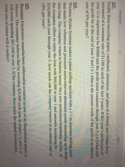 The profit at the end of year 2 is 7200 and so on for fouryears find the present worth of the profit at an interest rate of9 per year. Profits from recycling paper cardboard aluminum and glass at FKP have increased at a constant rate of RM 1100 each year. If this years profitend of the year 1 is expected to be 6000 and the profit trend continues through year 5 what is the present worth of the profit. If this years profit end of year 1 is expected to be 6000 and the profit trend continues through year 5 a what will the profit be at the end of year 5 and b what is the present worth of the profit at an interest rate of 8. If this years profit end of year 1 is expected to be 6000 and the profit trend continues through year 5a What will the profit be at. Profits from recycling paper cardboard aluminum and glass at a liberal arts college have increased at a constant rate of 1100 latex in each of the last 3 3 years.